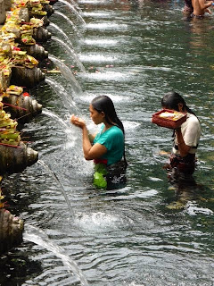 So little time left, so much left to do. I've been through these emotions before, sad to be leaving and excited to be anticipating reunions with family and friends. Some days, after extremes of heat and feeling listless, headaches and fuzzie thinking, we admit we are ready to return home. Then it cools off, we enjoy afternoon coffee and dinners with friends, lazy days with no agendas or requirements, soft nights swimming in a darken warm pool under the new moon, and greetings from all of the Balinese we've met who recognize us and have enriched our stay...then I hate to think of leaving! We hired a driver yesterday and left early in the morning before it got too hot and went to see two sacred water temples. One, Gunung Kawi, was built in the eleventh century, carved into the rock face of a mountain deep within a valley of tropical trees and streams of water. Both men and woman have to wear sarongs wrapped around their legs as a sign of respect. We walked the 315 steep steps down the hill to see the temple. Sadly there were way too many people selling carved bone , sarongs, coconuts, food and drinks. They all have the same things and each call out to you to "buy something". It would be much more pleasant and tranquil without the intrusion, but this is the Bali way. Even so, the scenery was beautiful, almost like finding a hidden treasure at the end of a steamy walk. A priest dressed all in white walked the trail just ahead of us, and we were able to have a small whisk of sacred water placed on our heads for good luck. Then we drove to the next temple, a thousand year old natural spring called "Tirta Empul". People have been coming here to bath in the sacred waters to cleanse themselves of any bad spirits and refresh their karma. The water bubbles up from natural springs beneath the earth and is funneled into the pools via carved stone waterspouts. We were happy with another small dribble on our heads. From here our driver took us through tiny roads barely wide enough for one car and a passing motorcycle, through rice fields with long views of the valleys stretching all the way to Mt. Agung towering over the whole earth, it's apex shrouded in clouds. We stopped at a scenic spot for photos of curving hillside terraces of rice where unfortunately the tourist arrive enmass and traffic is heavy. We shot our photos and left, happy to be away from the rush of people and again driving along meandering hidden roads, seeing the real life of Bali. Simple, poor villages, chickens, stray dogs laying in the streets, straw roofed huts, dirt and trash, flowers and temples, and always the green fields of rice.